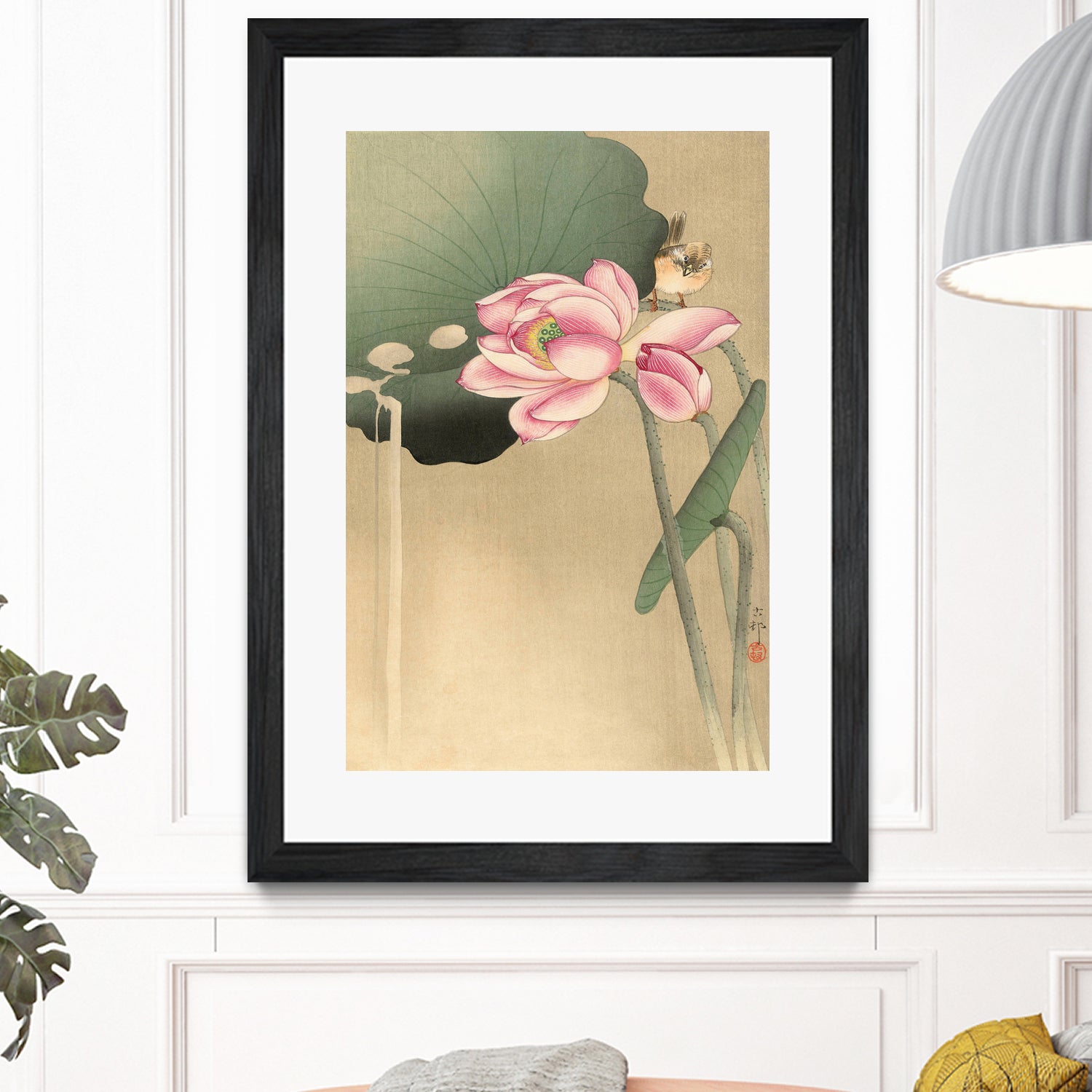 In Songbird and Lotus, Ohara Koson captures a delicate moment of stillness and life—a small bird perched beside a blooming lotus. Through his refined woodblock technique and subtle use of color, Koson evokes harmony, transience, and the poetic connection between nature and spirit found in traditional Japanese art.