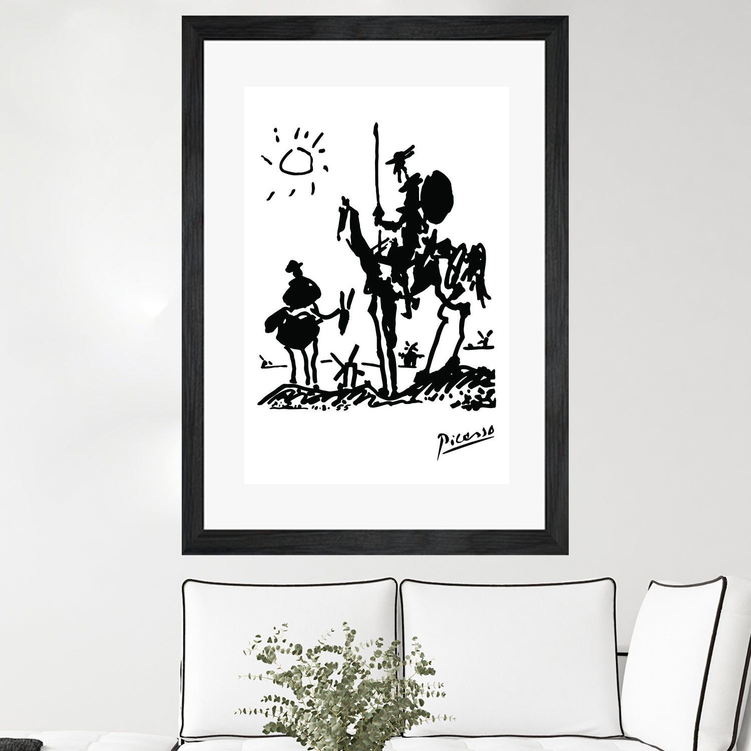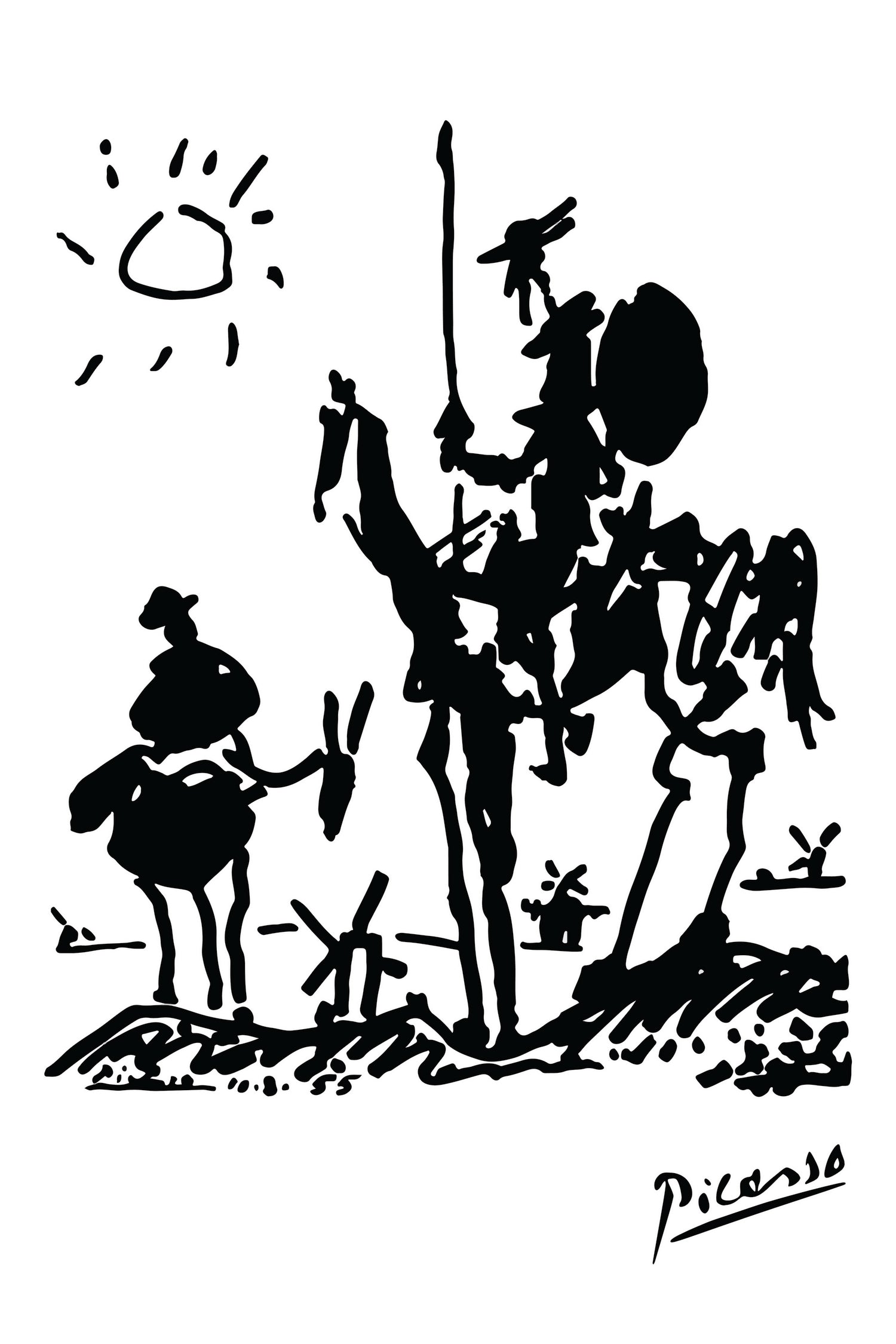 Don Quixote (1955) by Pablo Picasso is a bold black-and-white drawing depicting Cervantes’ famous characters Don Quixote and Sancho Panza. Created with expressive, energetic brushstrokes, the minimalist composition captures the spirit of the wandering knight and his loyal squire, becoming one of Picasso’s most iconic modern illustrations.