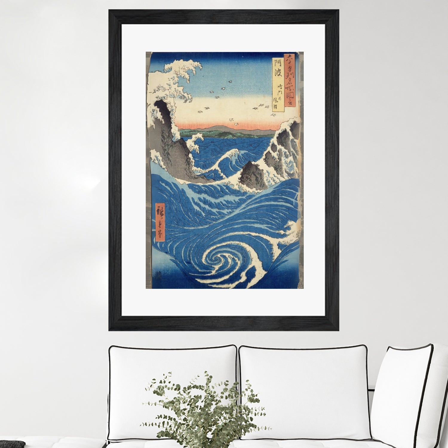 Naruto Whirlpools (1857) by Utagawa Hiroshige is a woodblock print from his series Awa Province: Naruto Whirlpools. It depicts the dramatic tidal currents of the Naruto Strait in Japan, with swirling waves rendered in bold lines and color. The work reflects Hiroshige’s mastery of landscape ukiyo-e, blending natural power with lyrical beauty.